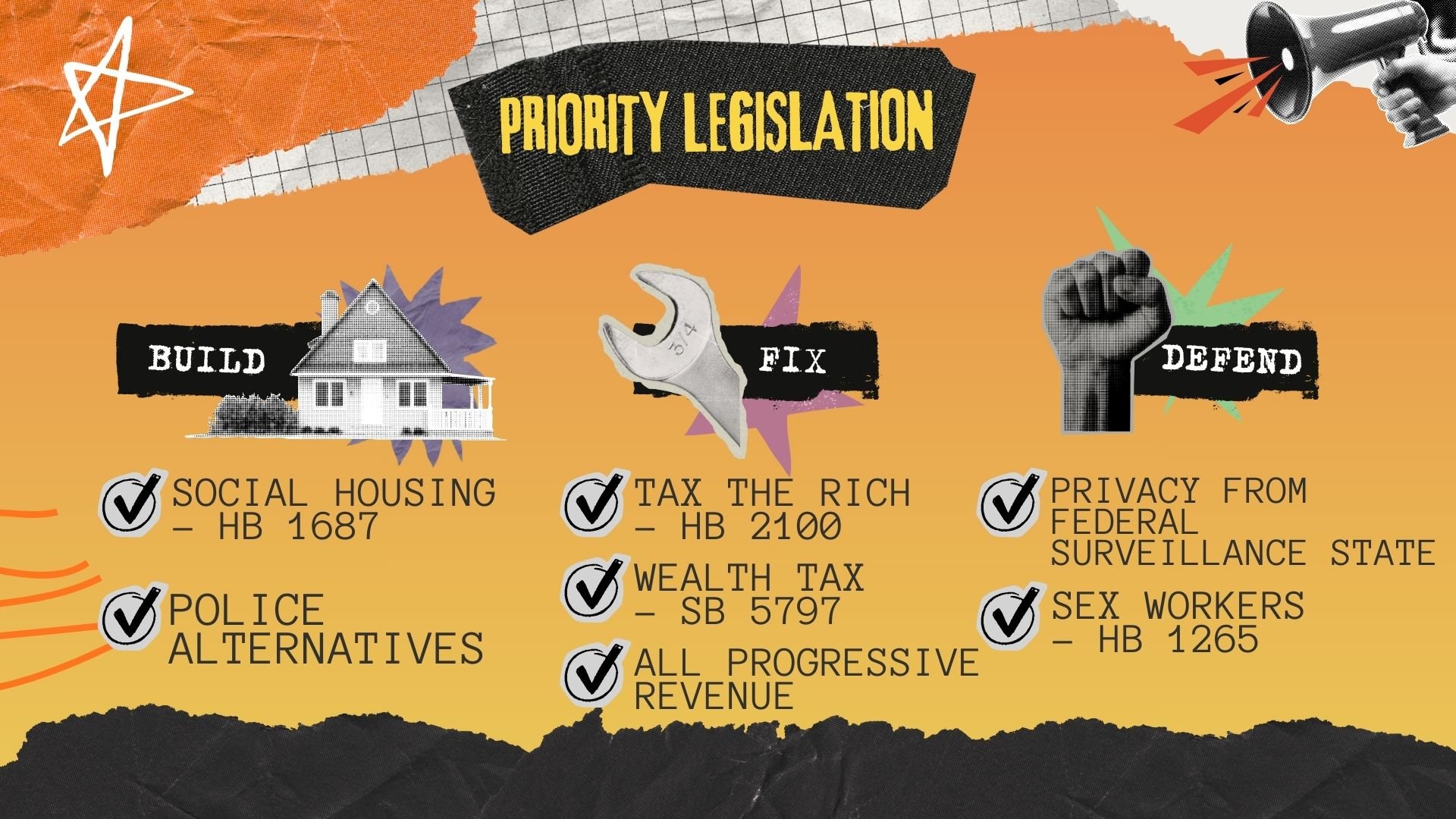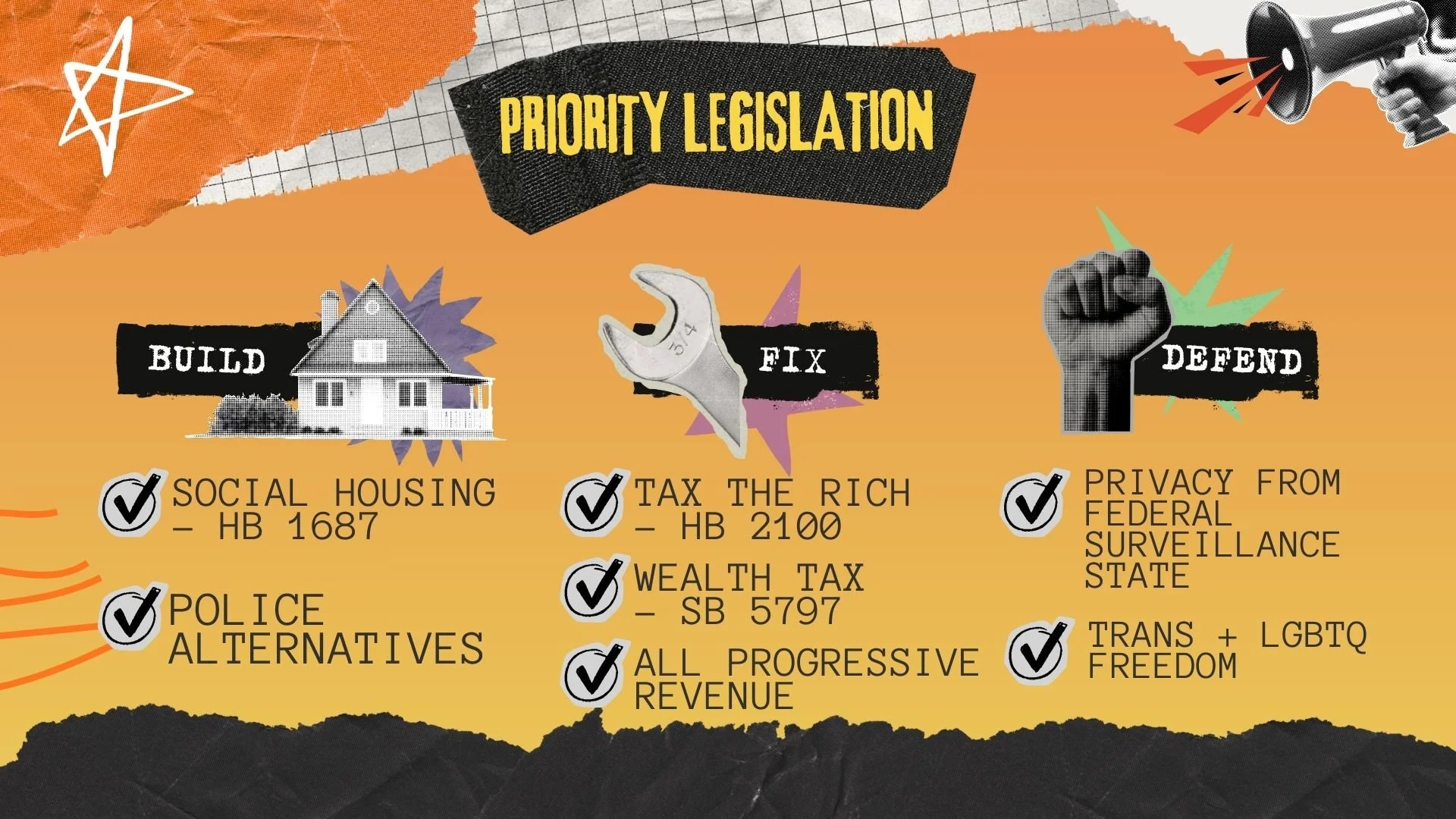 Read about some of our priority legislation with experts on the issues. Thank you to ACLU WA, House our Neighbors, and Balance Our Tax Code for the resources.